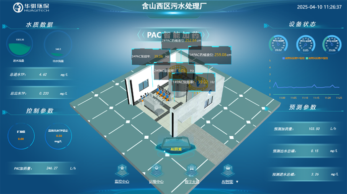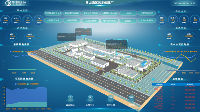 含山西區(qū)污水處理廠利用 3D引擎與數(shù)字孿生技術(shù),對(duì)廠區(qū)進(jìn)行全工藝流程建模,精準(zhǔn)復(fù)現(xiàn)格柵池、生化反應(yīng)池、二沉池等核心工藝段的運(yùn)行狀態(tài)。通過(guò)實(shí)時(shí)映射物理水廠的流量、壓力、溶解氧等關(guān)鍵參數(shù),并結(jié)合水務(wù)工藝數(shù)字化仿真算法,管理人員可在虛擬環(huán)境中模擬工藝調(diào)整、故障排查等場(chǎng)景,實(shí)時(shí)進(jìn)行“所見即所得”的遠(yuǎn)程調(diào)控。例如,在曝氣環(huán)節(jié)異常波動(dòng)時(shí),系統(tǒng)可自動(dòng)生成3D可視化報(bào)警與優(yōu)化建議。
